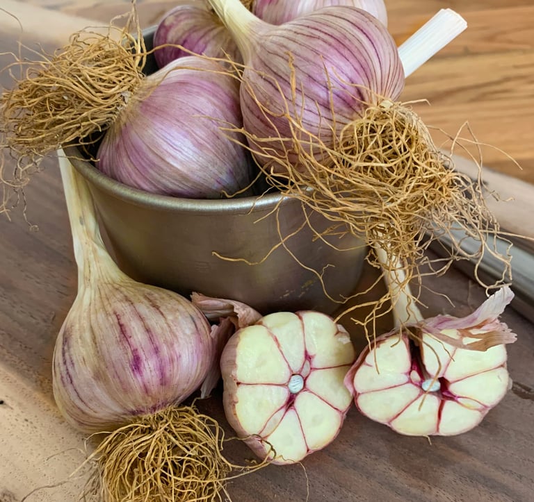 A hardneck variety with large purple striped bulbs containing 6-8 plump cloves. Great all-purpose garlic with a mild, but rich flavor.
